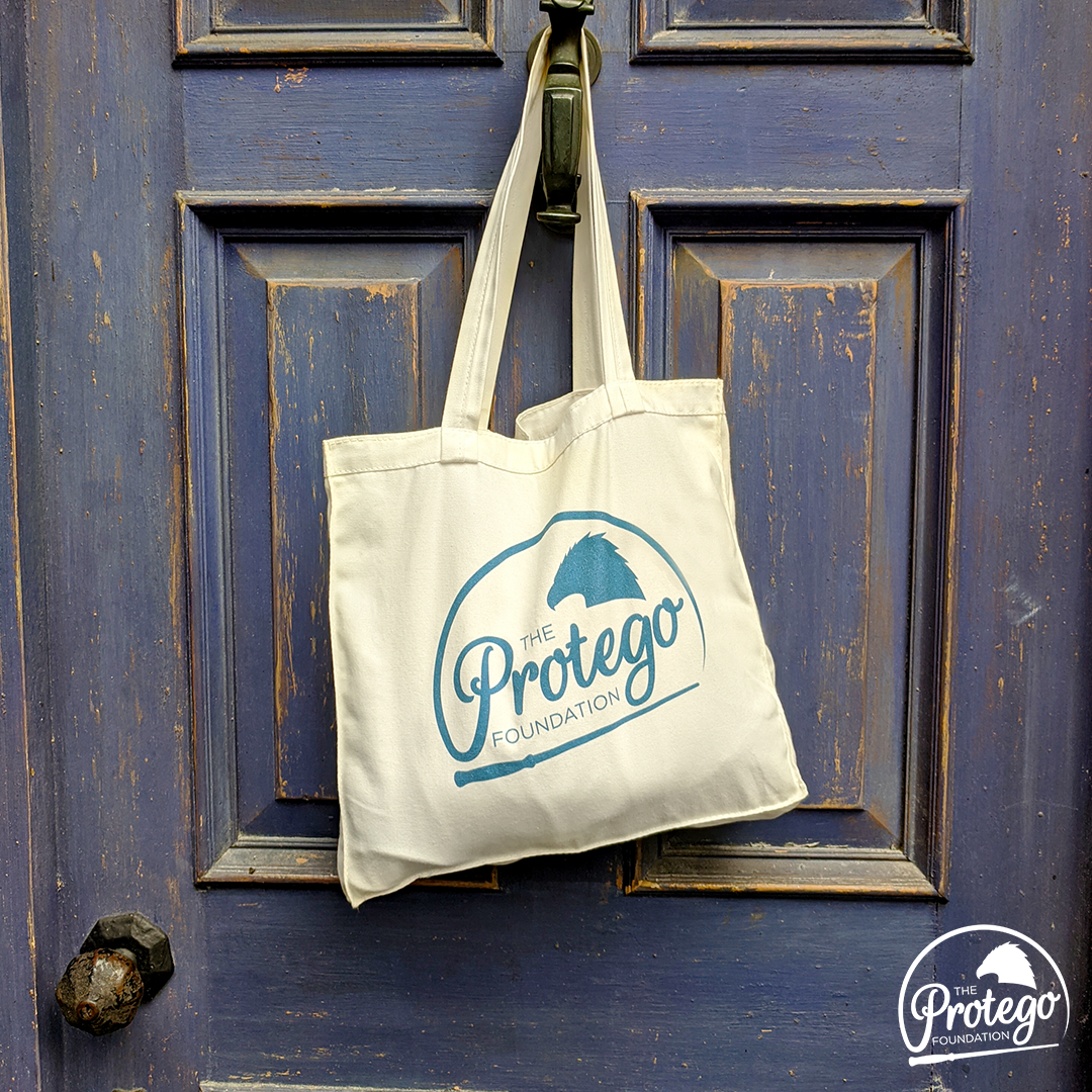The perfect bag for your wands and books, this tote features the Protego Foundation logo in its signature teal color. Say goodbye to plastic, and bag your goodies in this organic cotton tote bag.